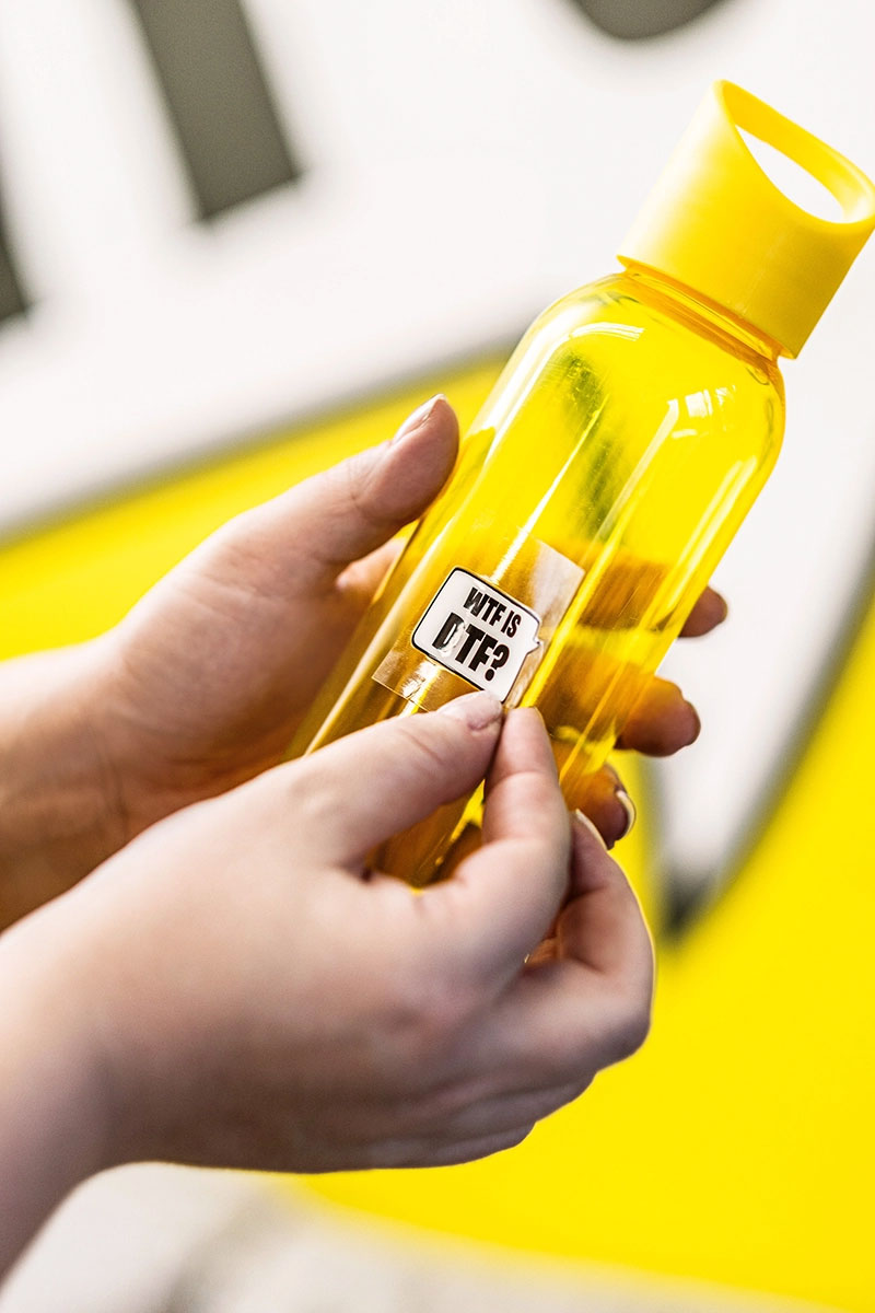 Vähän kuin siirtokuvat, mutta koville tuotteille! UV DTF -tarra kiinnittyy lähes mille tahansa sileälle pinnalle, kuten lasiin, metalliin tai muoviin. Kiinnittäminen ei vaadi erikoistyökaluja eikä prässejä: riittää, että asemoit tarrat siirtokalvon avulla ja hankaat kiinni.