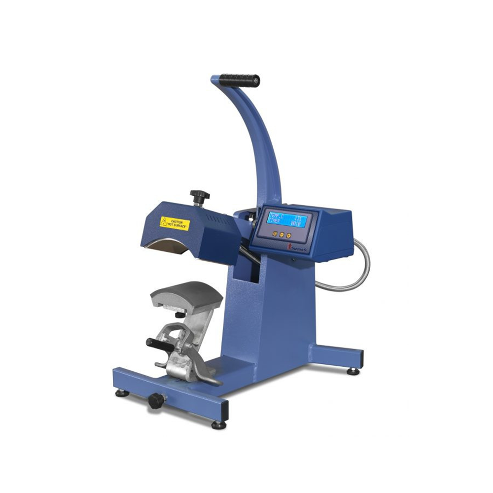 Manuaalinen lippalakkiprässi siirtokuvien kiinnitykseen.